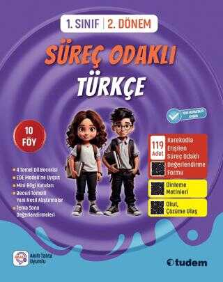 1. Sınıf 2. Dönem Su¨re. Odaklı Tu¨rkçe, yalnızca bilgiyi öğretmek ve ölçmekle kalmaz; aynı zamanda öğrenme su¨re.lerini derinlemesine keşfetmeyi sağlayan yenilikçi bir yaklaşım sunar. Öğrenme çıktıları doğrultusunda hazırlanan bu kitap, temalara göre du¨zenlenmiş föylere ayrılmıştır. Her temada, konunun önemli noktalarını hatırlatan Mini Bilgi kutuları ve konunun pekiştirilmesini sağlayan Beceri Temelli Yeni Nesil Alıştırmalar yer almaktadır. Tema sonlarındaki Tekrar Edelim başlıklı tema sonu değerlendirme çalışmaları, öğrencilerin konuyla ilgili eksikliklerini gidermelerine yardımcı olurken 2. Dönem Değerlendirme f.yu¨ ise