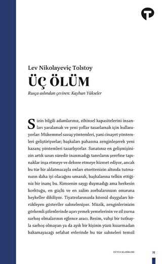 Tolstoy’un üç farklı ölüm üzerinden insanlığın temel konusu ölümü anlattığı Üç Ölüm, daha önce Türkçede yayımlanmamış Işık Varken Işıkta Yürüyün ile birlikte Kayhan Yükseler’in Rusça aslından çevirisiyle...